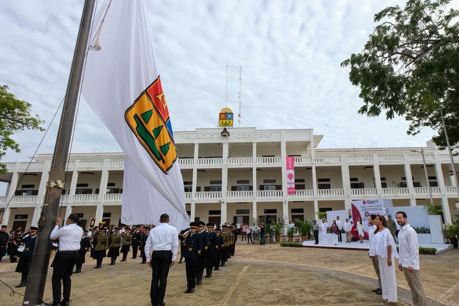 Chetumal.- La gobernadora Mara Lezama Espinosa encabezó la ceremonia de izamiento de la bandera de Quintana Roo en ocasión del 51 aniversario de su creación como Estado Libre y Soberano, evento en el que se estrenó la Banda de Guerra Monumental de más de 112 elementos, niños y jóvenes, así como las escoltas de Bandera Nacional y Estatal que se integra con 8 organizaciones cívicas libres y planteles educativos.