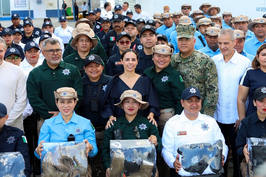 Cancún.- Con el objetivo de dignificar la labor de las y los policías y continuar avanzando en la recuperación de la tranquilidad de las familias benitojuarenses, la presidenta municipal, Ana Paty Peralta, encabezó la entrega de uniformes para la Transformación Policial en la explanada de la Secretaría Municipal de Seguridad Ciudadana y Tránsito.