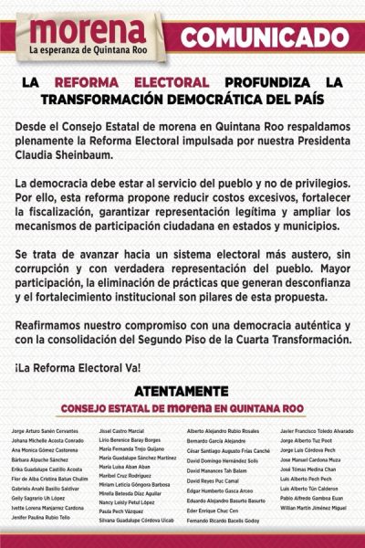 Cancún.- El Consejo Estatal (CE) de Morena respaldó la iniciativa de reforma electoral que presentó ese miércoles la presidenta, Claudia Sheinbaum, que contempla, entre otros puntos, eliminar plurinominales en el Senado, así como reducir 25% el presupuesto del INE y partidos políticos.
