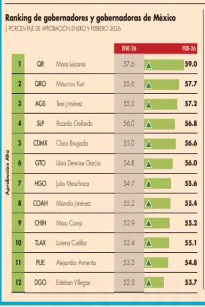 El levantamiento señaló que 13 gobernadores registraron una disminución en su aval ciudadano respecto a enero de 2026, lo que refleja una dinámica volátil en la percepción pública.
