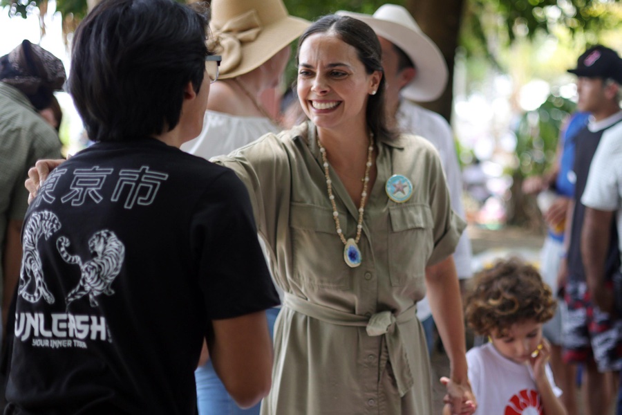 Acompañada por sus hijos, la primera autoridad municipal recorrió las mesas donde artistas plásticos, pintores, escritores, poetas y artesanos mostraron y comercializaron su talento y obras de arte, en medio de una verbena popular en dicho espacio al aire libre.