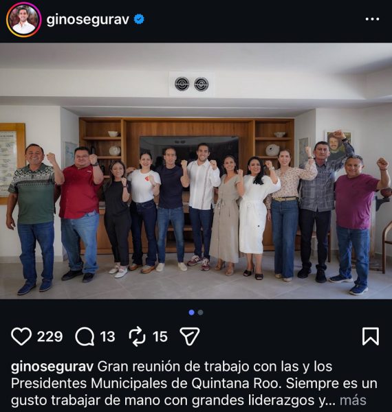 “Gran reunión de trabajo con las y los Presidentes Municipales de Quintana Roo. Siempre es un gusto trabajar de mano con grandes liderazgos y referentes, bajo el liderazgo de nuestra Gobernadora @maralezamaoficial por un mejor Quintana Roo. En Quintana Roo, trabajamos en unidad (sic)”, explicó en su cuenta de Instagram.
