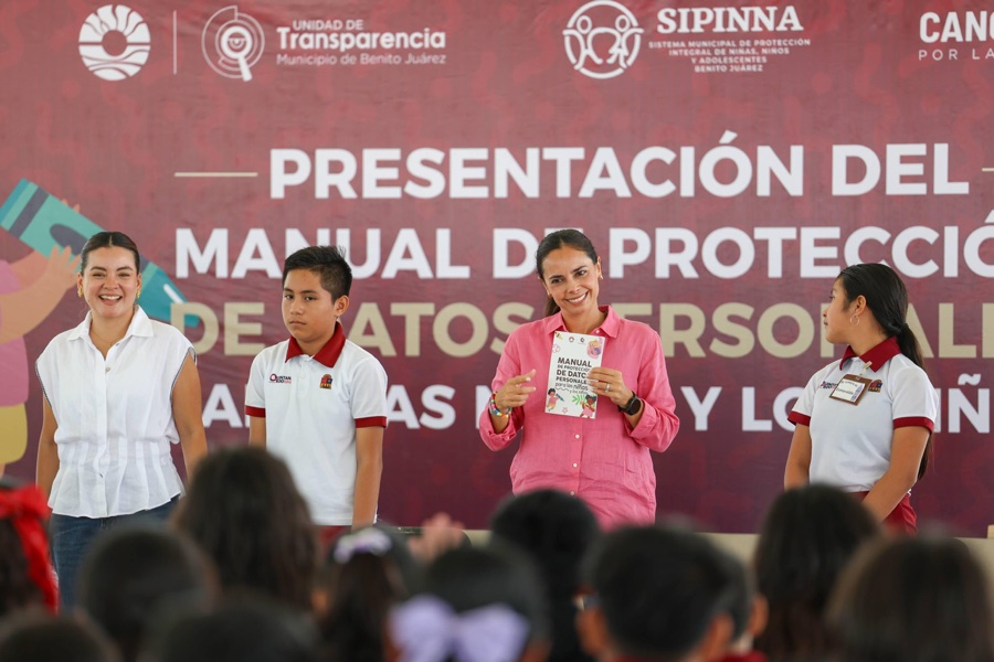 Cancún.- “Estamos aquí para cuidarlos, para protegerlos y para darles siempre todas las herramientas. Nuestra prioridad siempre es trabajar con las niñas, niños y adolescentes”, afirmó la presidenta municipal, Ana Paty Peralta, en la presentación y primera entrega del Manual de Protección de Datos Personales para las Niñas y Niños, que les permitirá a las nuevas generaciones comprender el uso responsable de la tecnología y la prevención de riesgos digitales.