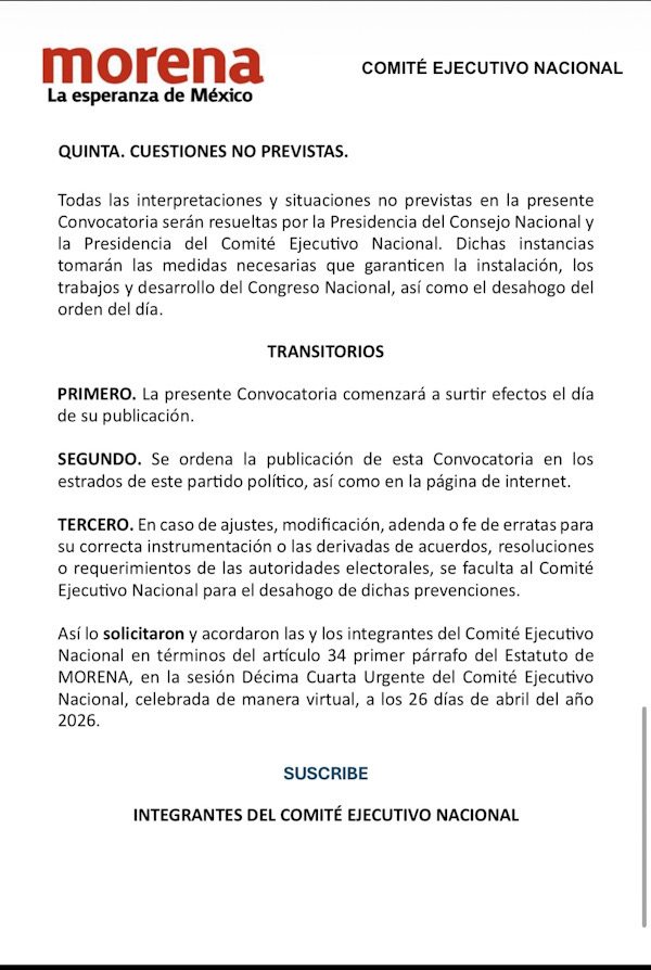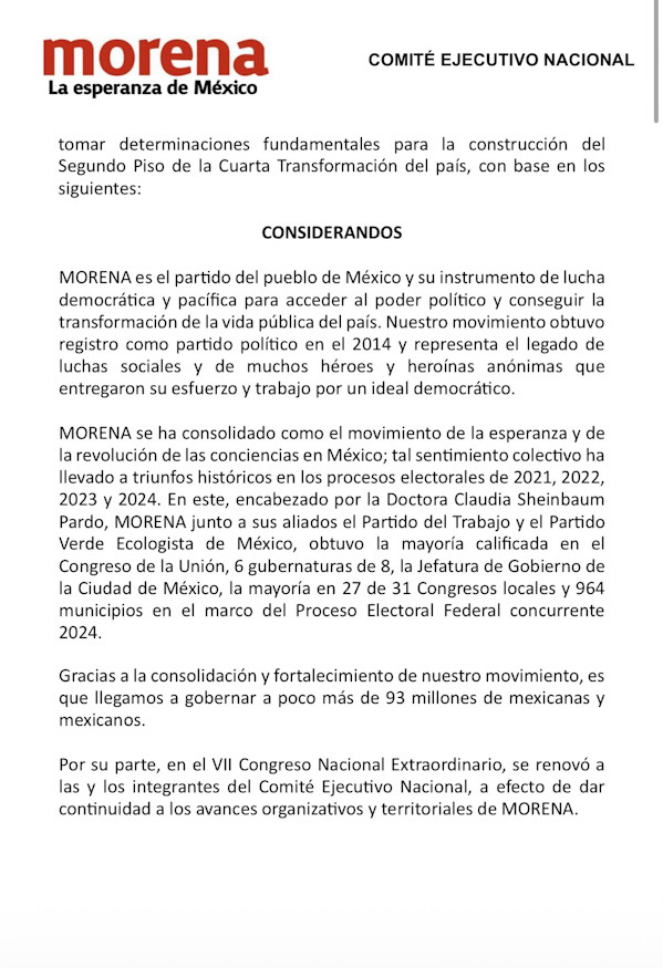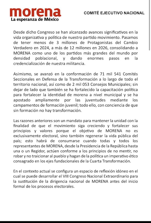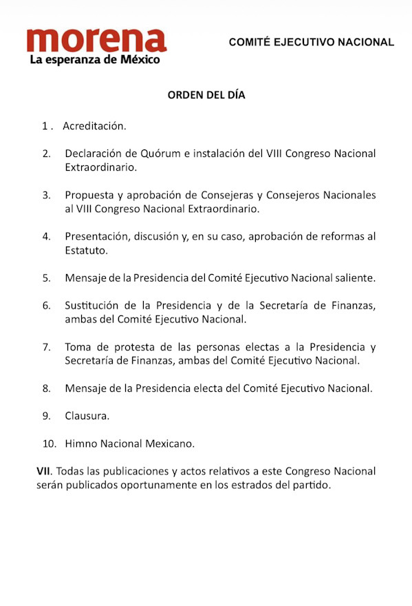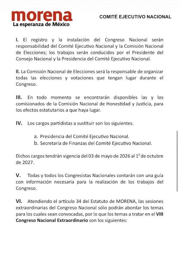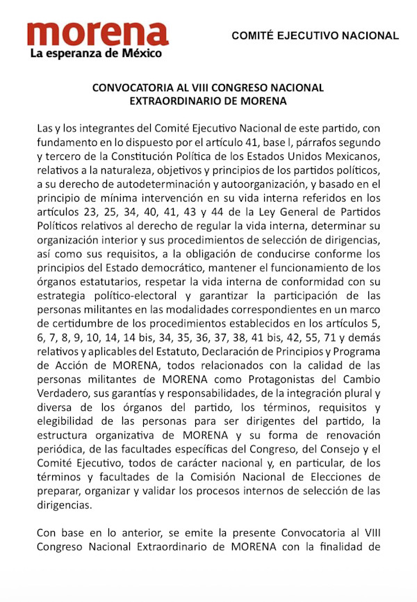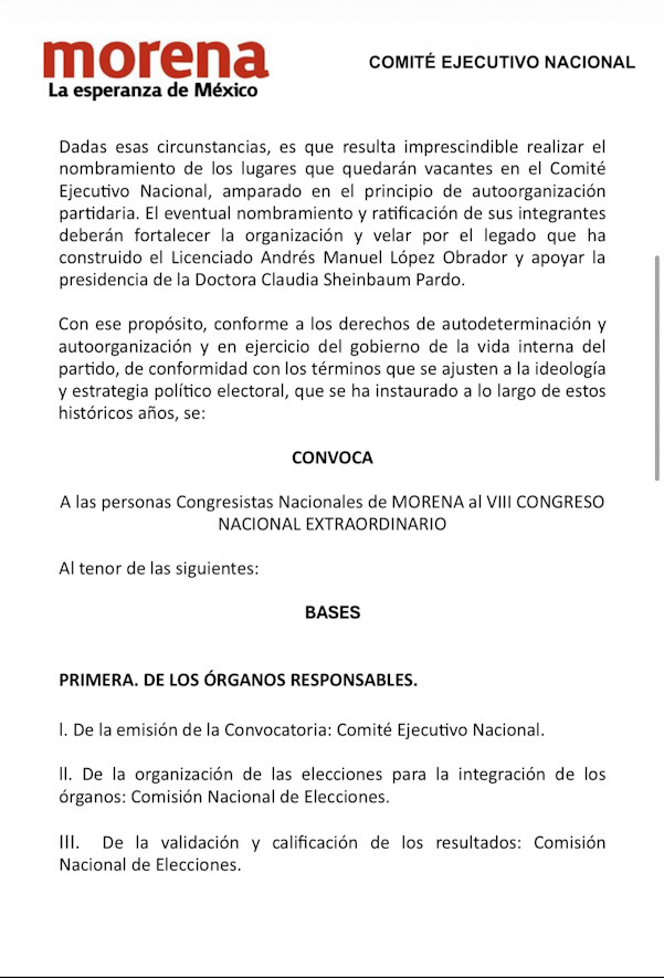 Morena convoca a Congreso Nacional este domingo (DOCUMENTO)
