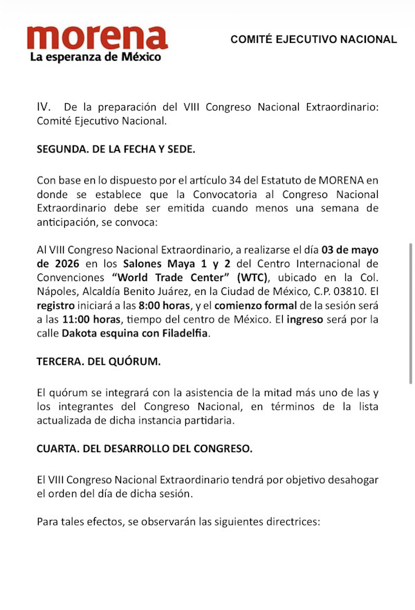 Cancún.- El Comité Ejecutivo Nacional (CEN) de Morena emitió la convocatoria al VII Congreso Nacional extraordinario, que se celebrará este domingo 3 de mayo a las 11:00 horas (12:00 hora de Quintana Roo), en el World Trade Center de la Ciudad de México.